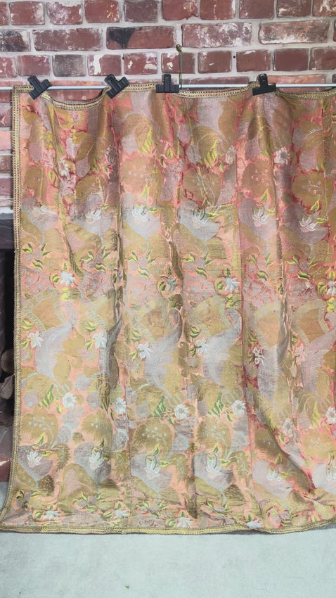 Brocaded with in silk , together with gold and silver metal threads Edged with 18th century braid and backed with antique magenta silk damask