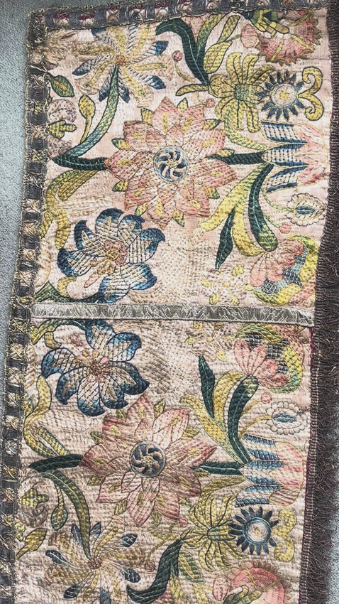 he entire surface of each individual panel worked in coloured silks between antique Silver metallic braid